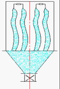 含塵氣體由布袋除塵器進(jìn)氣口進(jìn)入灰斗或儲灰箱,通過花板孔或直接通過花板孔三種方式進(jìn)入濾袋。如圖2a、b、c所示,含塵氣體透過濾袋變?yōu)閮魵猓M(jìn)入箱體,再經(jīng)箱體上部排氣口,由風(fēng)機排走。粉塵積附在濾袋的內(nèi)表面,且不斷增加,使袋收塵器的阻力不斷上升。當(dāng)阻力上升到1500—2000Pa阻力的時候,為了能使袋收塵器繼續(xù)工作,需定期消除濾袋上的粉塵。具體清灰時,首先關(guān)閉頂上風(fēng)機,搖動電機上偏心作用,帶動連桿,使搖動軸左右來回轉(zhuǎn)動,濾袋_呈波紋狀態(tài),使粉塵掉下,卸出。清灰狀態(tài)如圖3所示。