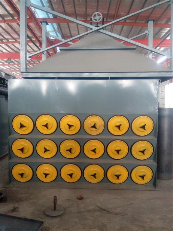 濾筒式除塵器的結(jié)構(gòu)是由進(jìn)風(fēng)管、排風(fēng)管、箱體、灰斗、清灰裝置、導(dǎo)流裝置、氣流分流分布板、濾筒及電控裝置組成,類似氣箱脈沖袋除塵結(jié)構(gòu)。
