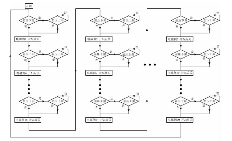 1號電磁閥→6號電磁閥→11號電磁閥→16號電磁閥→2號電磁閥→7號電磁閥→12號電磁閥→17號電磁閥→3號電磁閥→8號電磁閥→13號電磁閥→18號電磁閥→4號電磁閥→9號電磁閥→14號電磁閥→19號電磁閥→5號電磁閥→10號電磁閥→15號電磁閥→20號電磁閥→1號電磁閥。