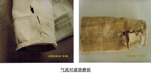 除塵器布袋在使用過程中經(jīng)常會(huì)出現(xiàn)除塵器濾袋口損壞的現(xiàn)象,而且這一現(xiàn)象出現(xiàn)還是比較嚴(yán)重的,到底是何原因致使除塵布袋漲圈下面20公分左右出現(xiàn)損壞呢?主要原因_是袋式除塵器的噴吹管上面打的噴吹眼不正,袋式除塵器噴吹管不正會(huì)直接影響除塵濾袋的使用壽命,濾袋的破損出現(xiàn)在距袋u向下左右處,此處???為側(cè)面破損沿噴吹管方向連續(xù)幾個(gè)排列,在煙氣流也方向側(cè)磨損較重,有的濾袋甚至發(fā)生圓周性斷裂,其破損應(yīng)為氣體攜帶灰粒由內(nèi)向外向下沖刷而成,濾袋內(nèi)部出現(xiàn)由上至下的大片織布磨損現(xiàn)象,并露出自色PTFE基布,分析原因?yàn)閲姶倒車姶禃r(shí)夾帶灰粒氣流被煙氣引流導(dǎo)致氣流偏斜至煙氣流出方向。對(duì)于針刺濾袋一部分_細(xì)粉塵進(jìn)人纖維層內(nèi),噴吹氣流在清灰時(shí)因氣流不暢,不能很好將能量釋放,在袋內(nèi)形成強(qiáng)大的氣流而沖擊濾袋,造成濾袋晃動(dòng)互相磨損袋底,以及將袋底吹裂。另一部分氣流從袋日返出,從而磨損袋口。濾袋底部側(cè)壁的作用力_加強(qiáng)大。此時(shí),如果噴吹壓力偏大,袋身過濾含濕量大的煙氣后透氣性變差,袋底腐蝕“塑化”、強(qiáng)力下降,造成濾袋底部出現(xiàn)沿袋底縫線圓周折皺折裂痕跡。第四,該除塵器使用的為鋼袋籠,外部噴涂有機(jī)硅防腐材質(zhì)。由于使用年限較長(zhǎng),及_換除塵濾袋時(shí)對(duì)其磕碰導(dǎo)致部分防腐材料脫落,出現(xiàn)不同程度的銹蝕,袋籠的銹蝕對(duì)與濾袋的磨損與腐蝕影響也較大,使袋底強(qiáng)度降低。