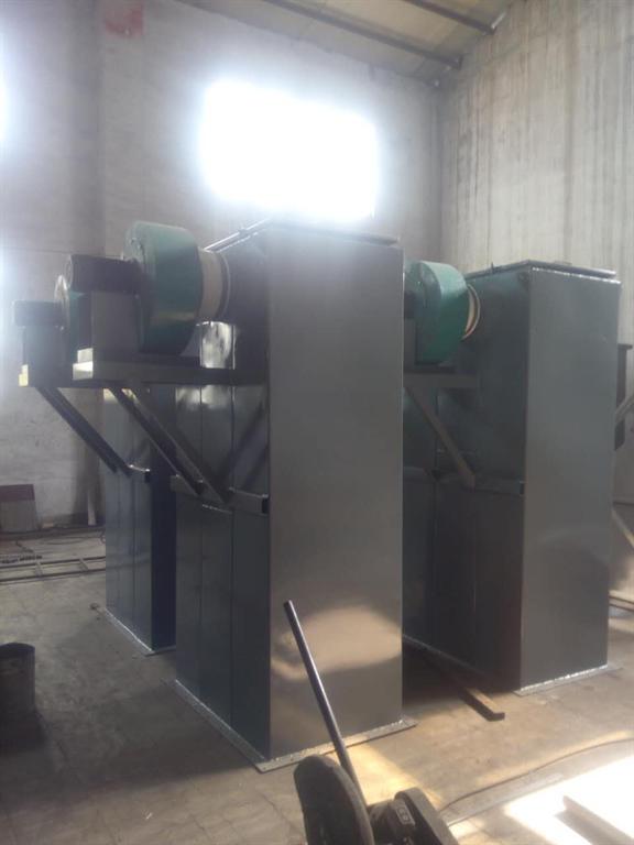 倉頂除塵器是一種方形可拆的金屬柜,底板上有24個嵌入圓形孔,它設有24條濾袋,分三組(每組8個)分別扎緊在上端3個振動器的吊架上,定時分別拉動三組吊架的牽動手柄,使濾袋阻留下來的灰塵降落在倉頂除塵器的方形金屬下端的料倉內(nèi)。